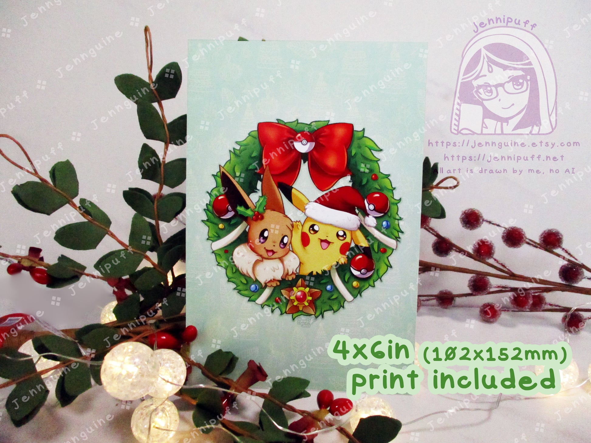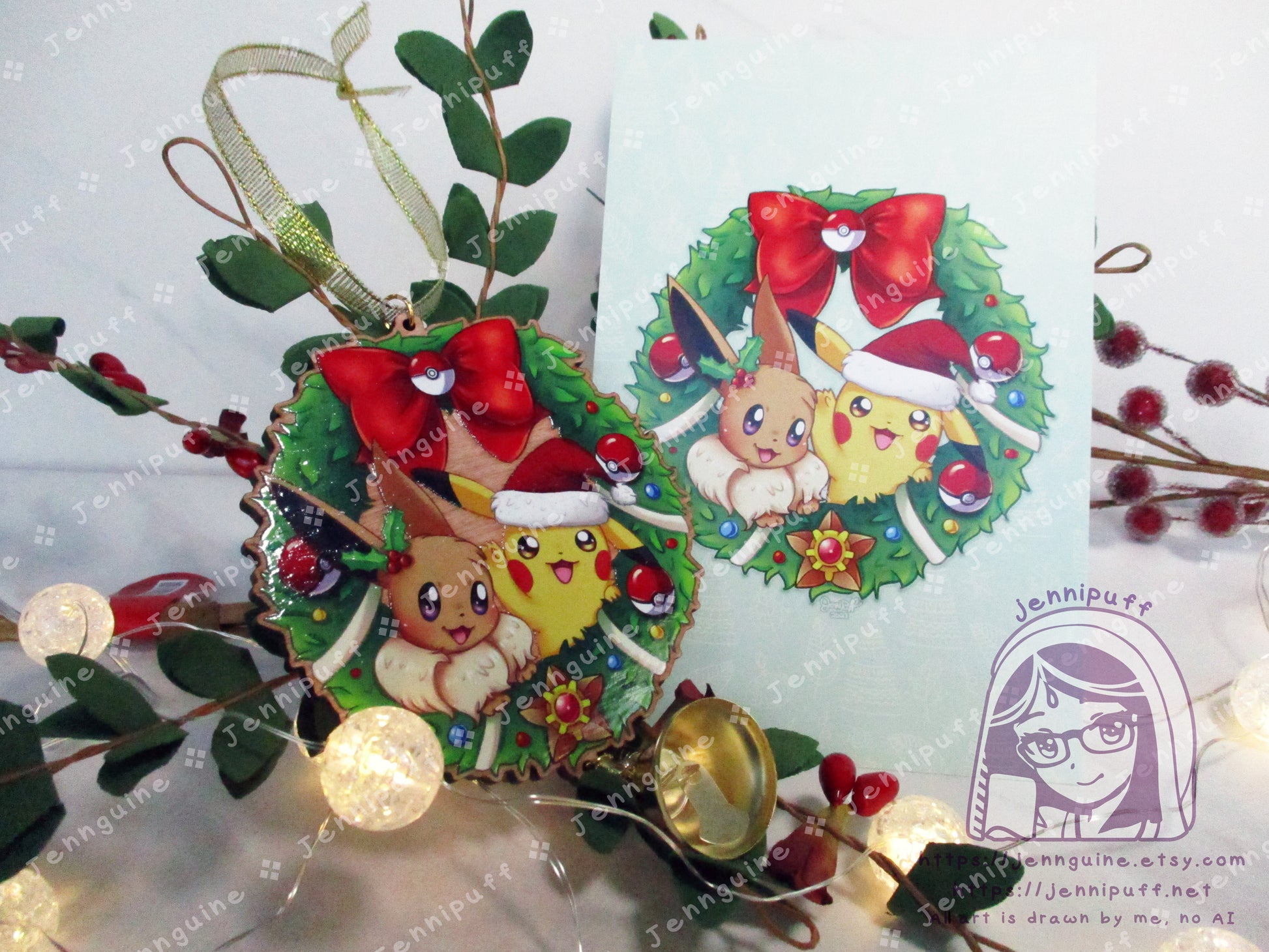 This wooden ornament features a glossy print of my drawing of Pikachu and Eevee behind a wreath decorated with Pokeballs and a mini Staryu.