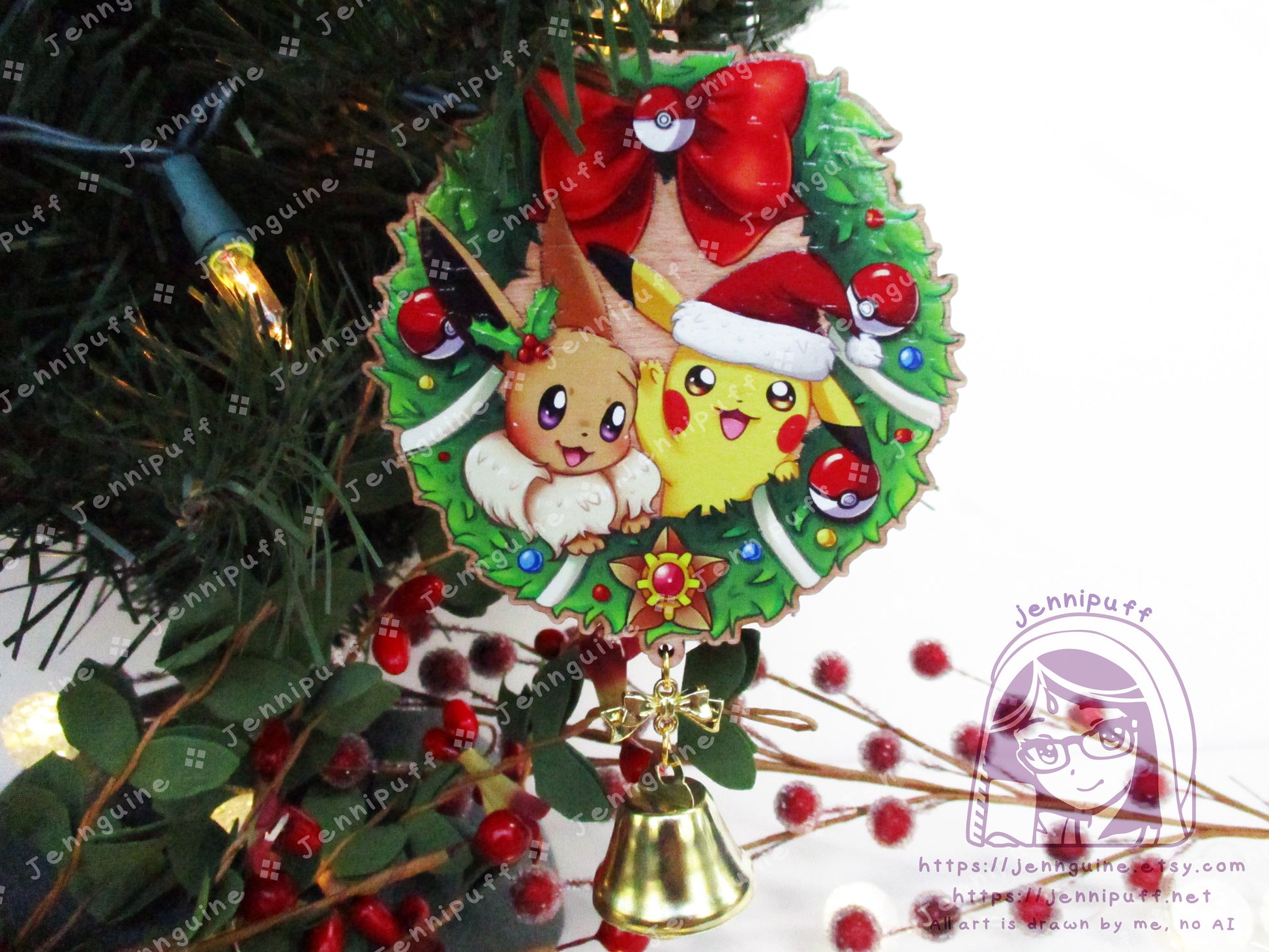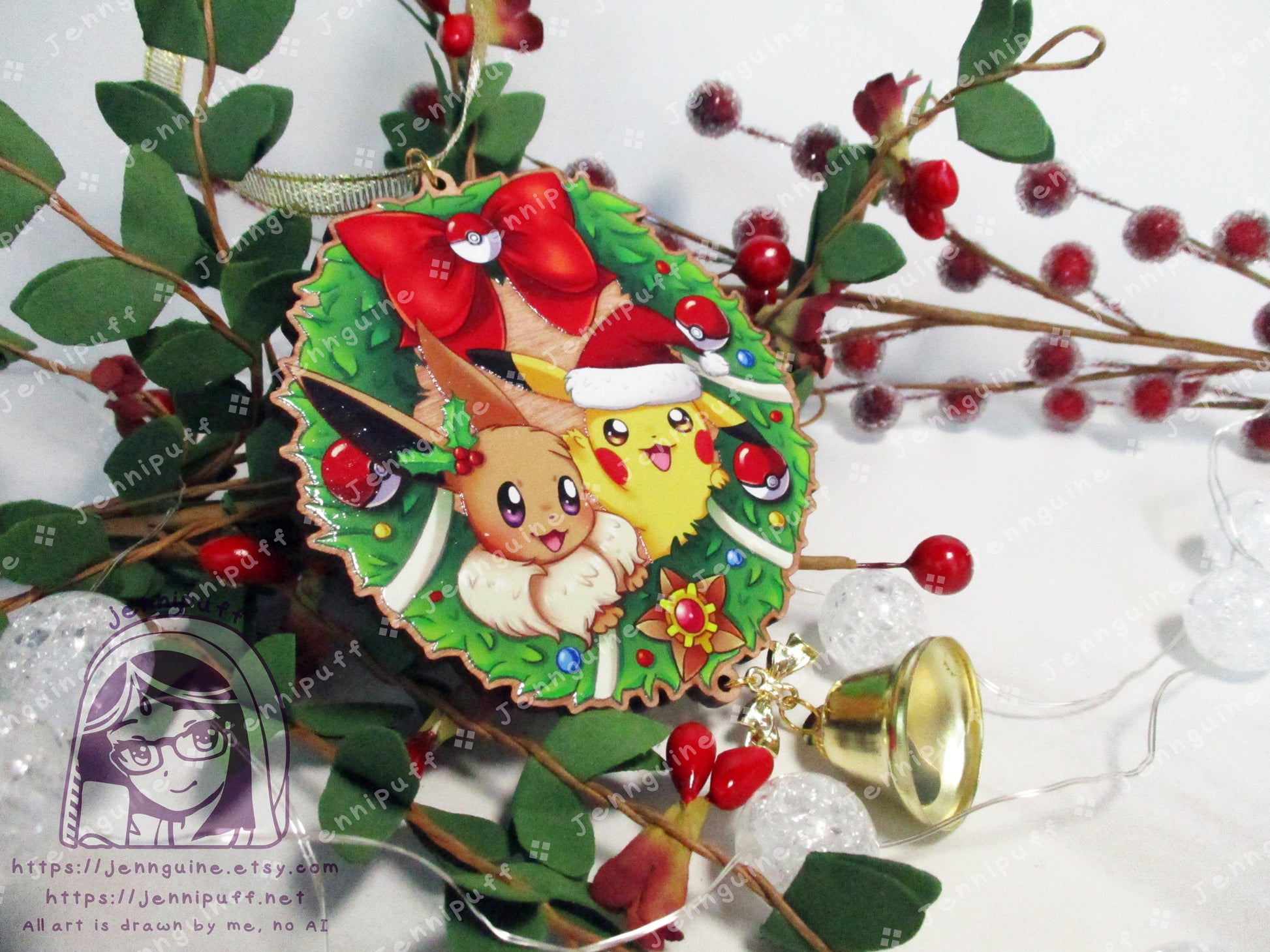 Wooden Christmas Ornament - Pikachu Eevee Wreath